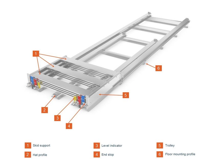 During the storage process, the top trolley is loaded with a pallet first. The next pallet pushes this trolley backwards into the channel at the colour-coded stop plates. This frees up the next trolley below, on which the pallet is then placed. This loading process is repeated until the channel is filled. The last pallet inserted then stands directly on the rails of the trolley system.