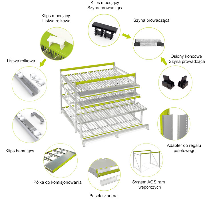 - Dostosowanie ilości ram rolkowych do składowanego towaru (siatka regulacyjna 20 mm dla wysokości i nachylenia)