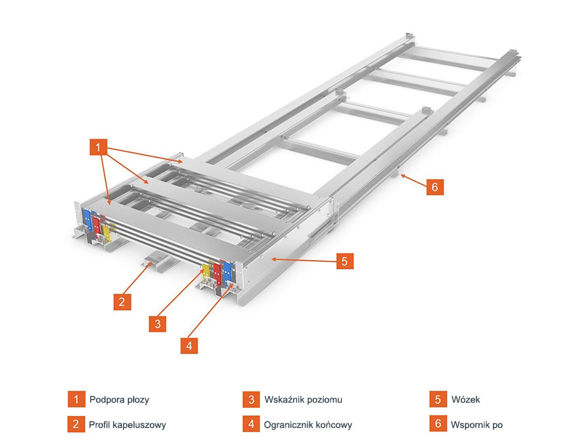Wózki o różnych rozmiarach poruszają się po systemie szynowym o nachyleniu szyn ok. 2,5%. Dzięki stożkowemu kształtowi poszczególnych wózków poziom składowania pozostaje w pozycji poziomej. Gdy kanał magazynowy jest pusty, wszystkie wózki ustawione są jeden nad drugim po stronie załadunkowej.